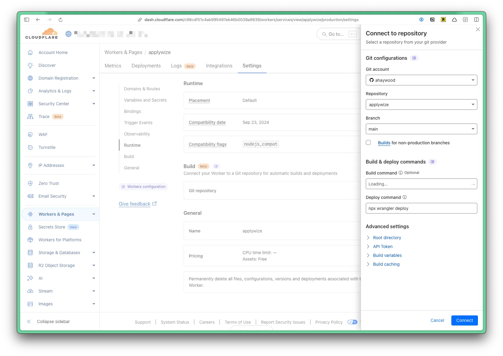 You can connect your application to GitHub, so that anytime you push a commit to a given branch, it will automatically deploy your application. Go to Workers & Pages in the left side navigation. Then, click on the name of your project. Click on the Settings tab. Near the bottom of the page, you’ll find a section called Build where you can connect GitHub.